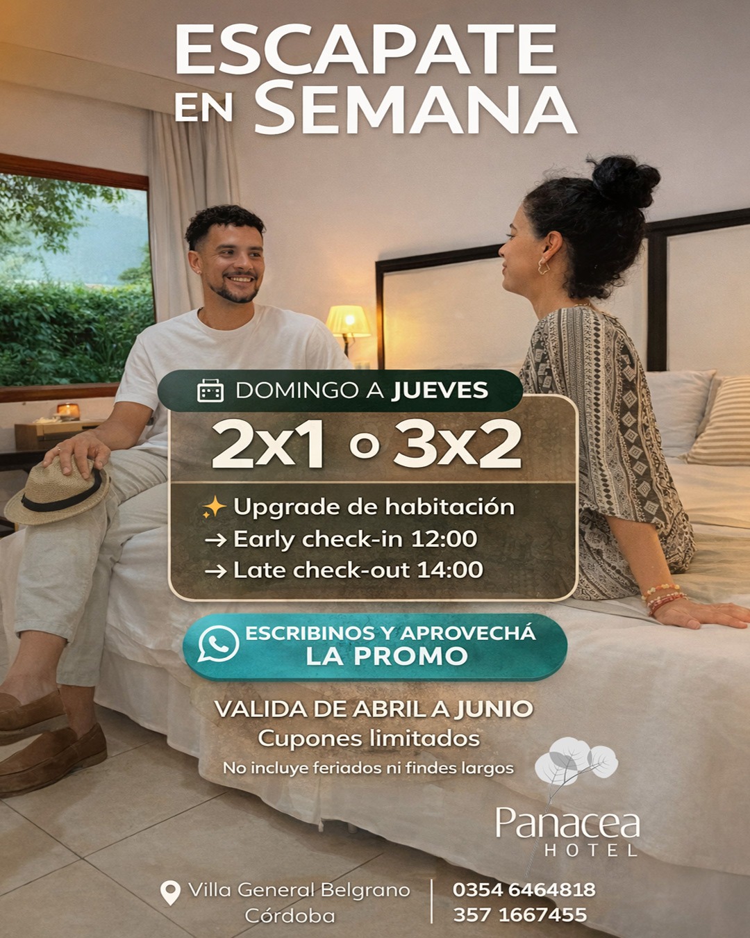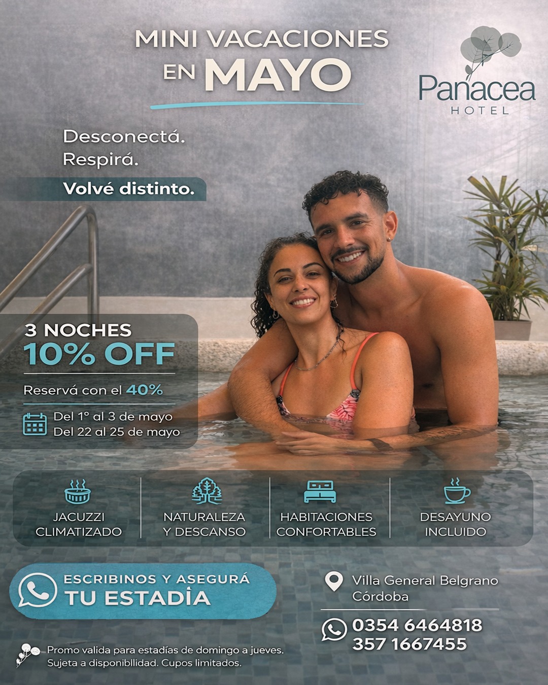 Islas Malvinas 151, Villa General Belgrano, Córdoba Cel: 3571 667455 – Tel.: 03546 464818 reservas@panaceahotel.com
